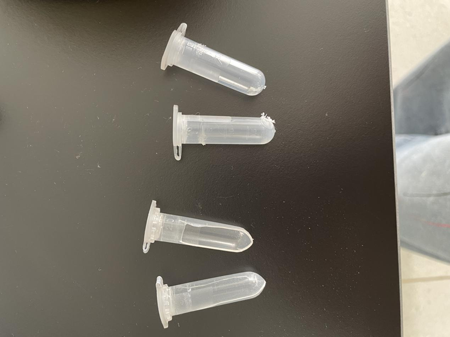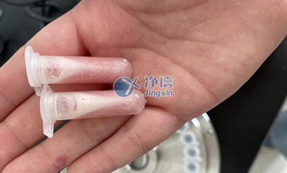 實驗開始客戶使用自配的離心管進行研磨,兩個樣品,另外添加兩個凈信生產(chǎn)的加厚研磨管進行四角配平,時間30s,功率調到4檔。客戶的離心管很薄,立馬被擊碎,凈信加厚研磨管沒有破裂但也出現(xiàn)了較嚴重磨損。