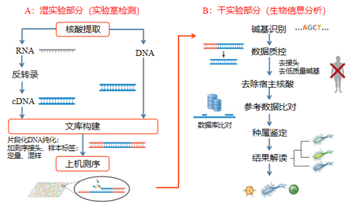 醫(yī)學(xué)檢驗(yàn)中采集病原微生物用于mNGS的樣本樣本類型主要有靜脈血、腦脊液、肺泡灌洗液、痰液、胸水和腹水、咽部分泌物、局灶穿刺物、組織等多種類型。mNGS的檢測流程可以大致分為5個(gè)步驟:核酸提取、文庫構(gòu)建、上機(jī)測序、生信分析與報(bào)告解讀。對病原微生物進(jìn)行測序前處理過程中關(guān)鍵的一步就是核酸提取,因?yàn)椴≡⑸锖怂崽崛⌒Ч暮脡?,?huì)直接影響到后續(xù)測序的成敗。