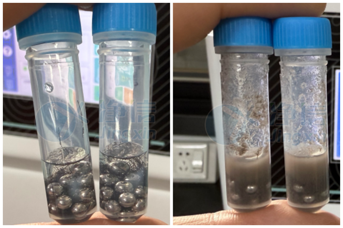 毛發(fā)樣品研磨前后對(duì)比,1分鐘內(nèi)可以研磨到勻漿狀態(tài)