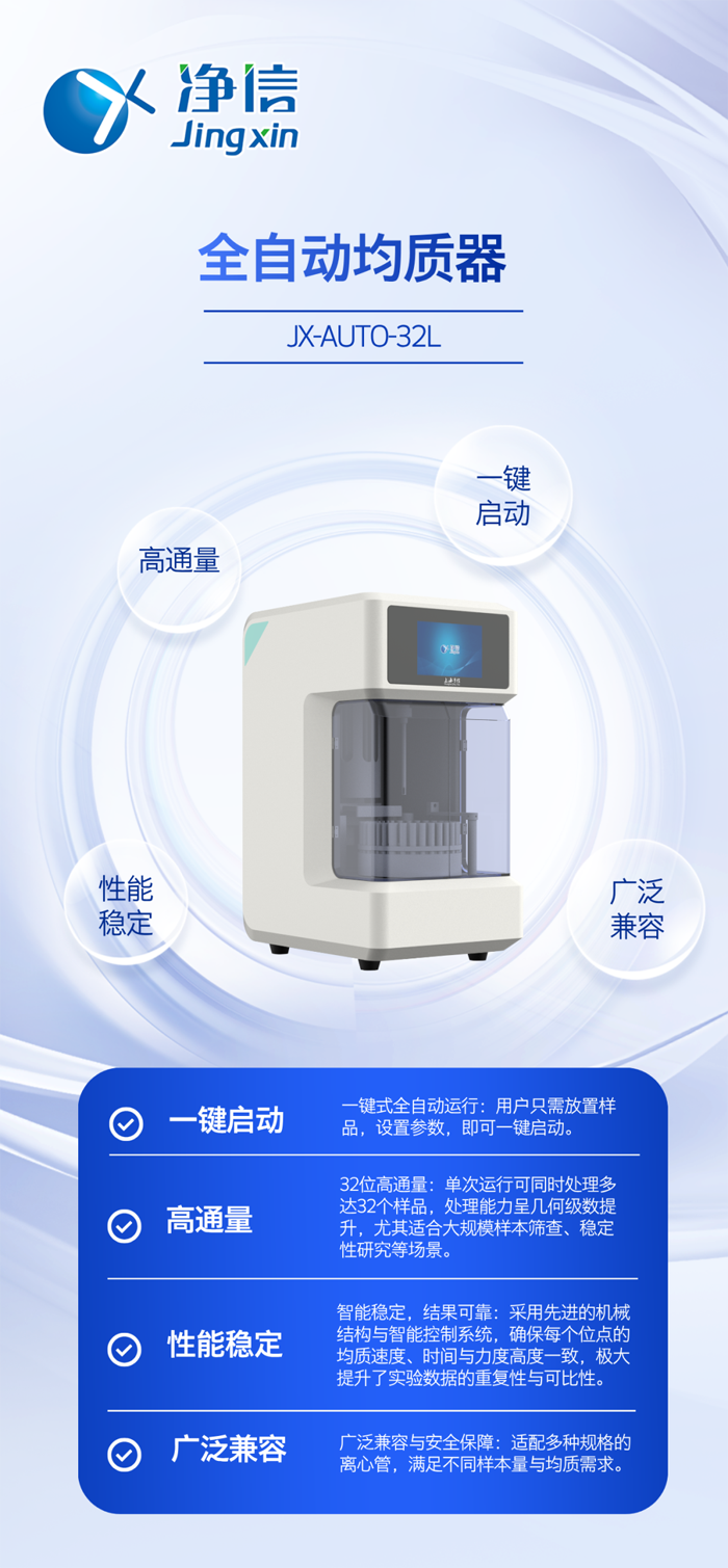 凈信JXAUTO-32L全自動(dòng)均質(zhì)器,不僅僅是一臺(tái)提升效率的設(shè)備,更是實(shí)驗(yàn)室邁向標(biāo)準(zhǔn)化、自動(dòng)化、智能化的重要一步。它通過取代重復(fù)性人工勞動(dòng)、保證數(shù)據(jù)源頭的一致性、大幅提升科研產(chǎn)出速度,為研究人員贏得了寶貴的創(chuàng)新時(shí)間。在追求效率的時(shí)代,JXAUTO-32L正成為眾多質(zhì)量控制、研發(fā)創(chuàng)新實(shí)驗(yàn)室中不可或缺的得力助手。