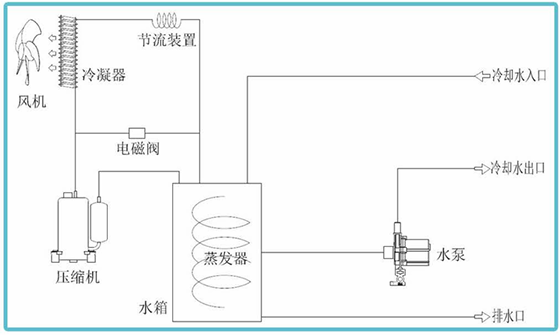 冷水機(jī)的組成是由壓縮機(jī)、冷凝器、節(jié)流裝置(膨脹閥或毛細(xì)管)、蒸發(fā)器和水泵等組成,其工作原理是由冷水機(jī)的制冷系統(tǒng)將水冷卻,由水泵將低溫冷卻水送入需要冷卻的設(shè)備,冷卻水帶走熱量后升溫并回流到冷水機(jī),再次冷卻后輸送回設(shè)備。